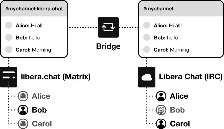 One of the core concepts of Matrix is interoperability with third party platforms via bridges. In the example of Libera Chat, when an IRC user appears on the Matrix side, it’s called a ghost. When a Matrix user appears on IRC, it’s called a puppet.
